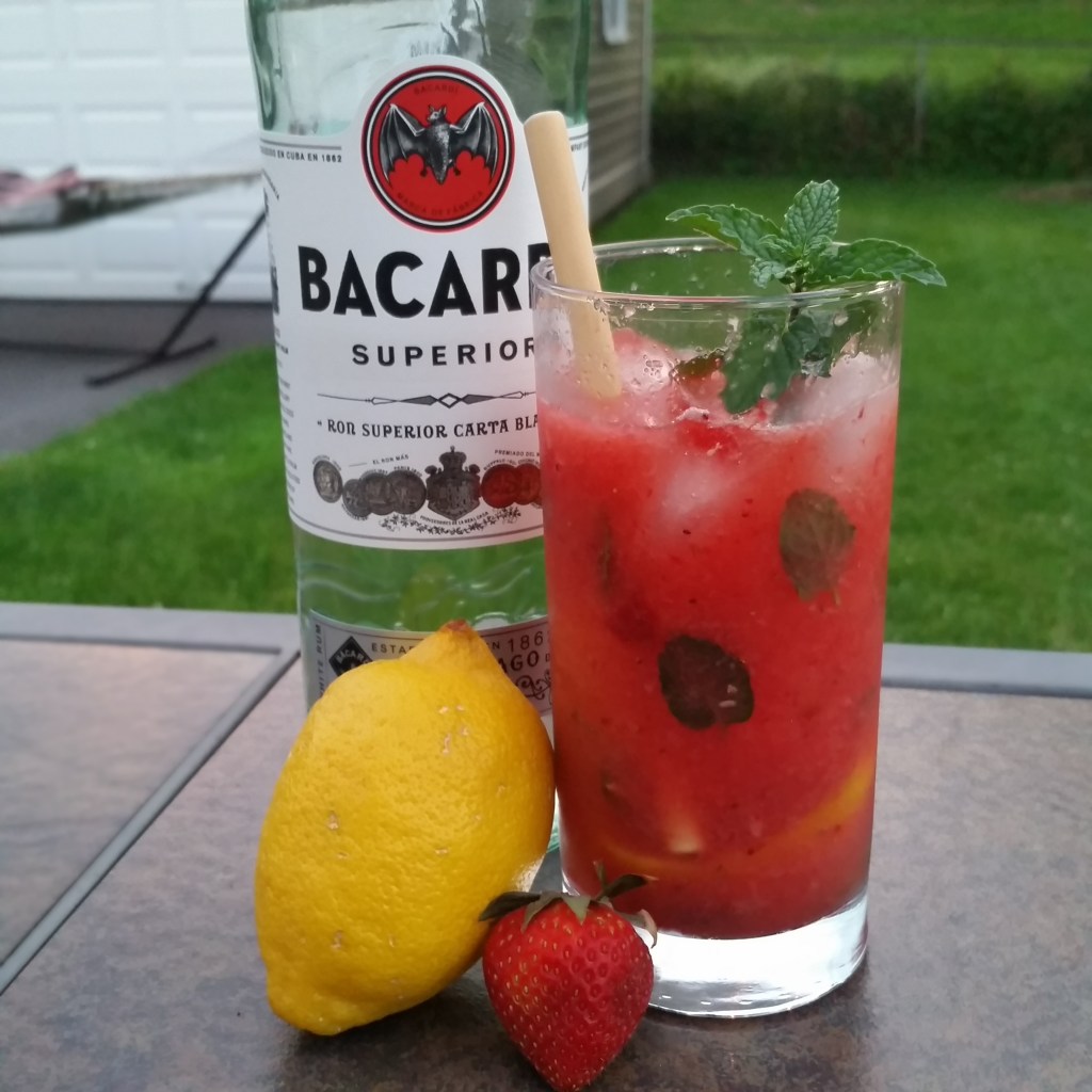 Directions: Remove caps from strawberries and blend with watermelon until slushy. Muddle lemon pieces over sugar in a collins glass. Clap mint leaves in hand and add to glass. Add rum. Fill glass with ice, then add blended juice; be sure to leave enough room to stir vigorously. Stir, garnish with sprig of mint, and add a straw.